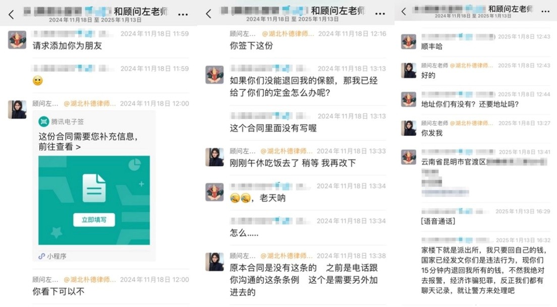 2024年12月,江西客戶S女士在網(wǎng)上看到一則“代理退保”的廣告,聲稱“全額退保,不成功不收費(fèi)”。因當(dāng)時(shí)經(jīng)濟(jì)壓力較大,并且缺乏對黑產(chǎn)中介的了解,S女士接觸了該所謂的“專業(yè)代理機(jī)構(gòu)”。在對方的誘導(dǎo)下,客戶以“銷售誤導(dǎo)”等虛假理由投訴保險(xiǎn)公司,要求全額退保,同時(shí)還向?qū)Ψ街Ц读?800元作為“定金”。然而后續(xù)幾天,S女士始終沒有等到對方的消息。