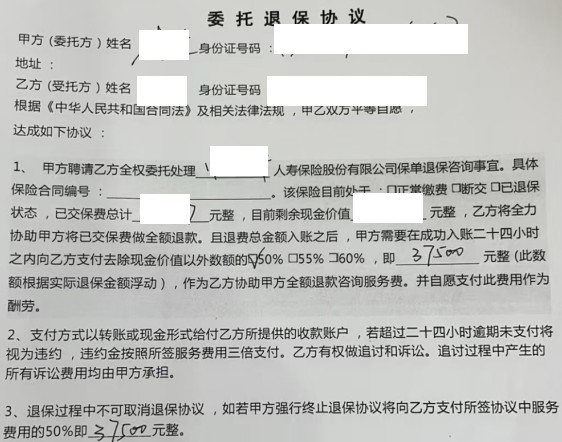 起初,李先生與所謂的“某律師”簽訂了一份委托退保協(xié)議,并聽從對方的要求編造虛假理由多方投訴保司。太平人壽工作人員多次邀約客戶面談但均被回絕,為取得客戶的信任,公司申請當(dāng)?shù)氐娜嗣裾{(diào)解委員會(huì)出面調(diào)解。在調(diào)解過程中,公司工作人員指出了該委托退保協(xié)議中存在的明顯漏洞——無論退保成功與否客戶都需向?qū)Ψ嚼U納一筆近4萬元的手續(xù)費(fèi)。隨后當(dāng)客戶撥通電話質(zhì)問這位“律師”時(shí),對方果然原形畢露,并威脅將依據(jù)該協(xié)議內(nèi)容上門追討。最終,客戶選擇報(bào)警處理,同時(shí)感謝太平人壽和調(diào)解員的耐心勸導(dǎo),并辦理了保單復(fù)效手續(xù)。