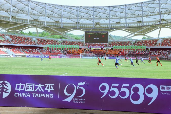 在20名太平人壽員工身著“中國(guó)太平”志愿者服裝組成的旗手隊(duì)手持中國(guó)太平標(biāo)志的中圈地鋪入場(chǎng)后,山東與江蘇兩支隊(duì)伍展開了激烈的對(duì)決。在助威團(tuán)的吶喊聲中,雙方隊(duì)員都展現(xiàn)出了出色的競(jìng)技狀態(tài),經(jīng)過90分鐘的角逐,雙方最終以2:2握手言和,精彩的比賽贏得了現(xiàn)場(chǎng)觀眾的陣陣掌聲和喝彩。