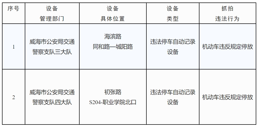 為保證道路交通安全,預(yù)防和減少交通事故的發(fā)生,根據(jù)《中華人民共和國(guó)道路交通安全法》及其實(shí)施條例等法律法規(guī)和相關(guān)技術(shù)規(guī)范的規(guī)定,依據(jù)《公安機(jī)關(guān)執(zhí)法公開規(guī)定》,現(xiàn)將威海市新增2處交通技術(shù)監(jiān)控設(shè)備予以公示,自6月3日起,將對(duì)有關(guān)交通違法行為進(jìn)行依法管理,請(qǐng)廣大交通參與者自覺遵守道路交通安全法律法規(guī),共同維護(hù)良好的道路交通環(huán)境。