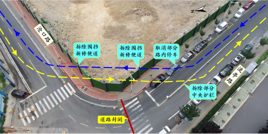 三、通行方案:施工期間,流亭路與滄口路交叉口南側(cè)道路封閉,在原有道路南側(cè)修筑便道,滿(mǎn)足車(chē)輛雙向兩車(chē)道通行。施工期間便道兩側(cè)禁止停車(chē)。