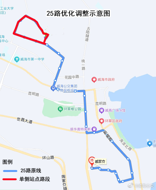 威高花園樞紐站改為途經(jīng)站,調(diào)整后,25路改為戚家夼環(huán)行運(yùn)行,由戚家夼發(fā)車,按原線運(yùn)行至威高時(shí)光城站點(diǎn)后,改行宮松嶺路、遠(yuǎn)遙墩路、臥龍山路、宮松嶺路按原線路返回戚家夼站點(diǎn)。威高花園區(qū)域站點(diǎn)調(diào)整為單側(cè)停靠。