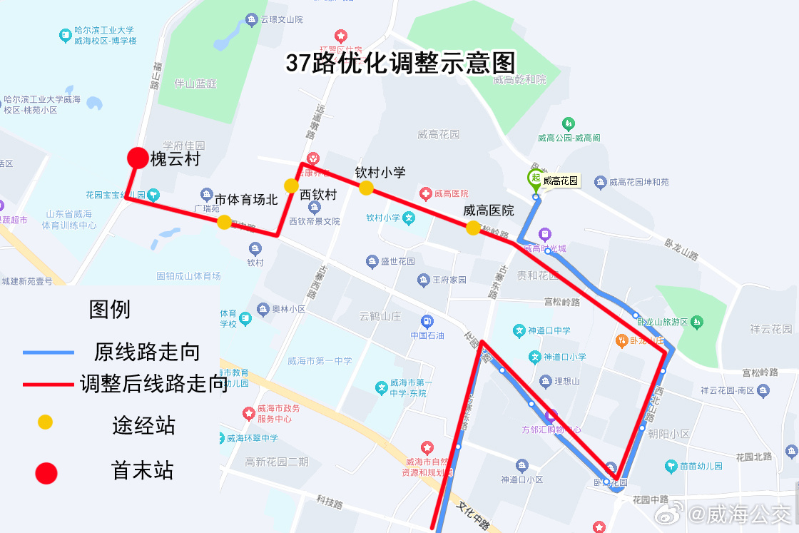 調(diào)整后,37路由西曲阜發(fā)車,按原線路運(yùn)行至威高時(shí)光城站點(diǎn),改行宮松嶺路、遠(yuǎn)遙墩路、花園中路、福山路至槐云村站點(diǎn),取消威高花園1個(gè)站點(diǎn),增設(shè)威高醫(yī)院、欽村小學(xué)、西欽村、體育場(chǎng)北、槐云村5個(gè)站點(diǎn)。