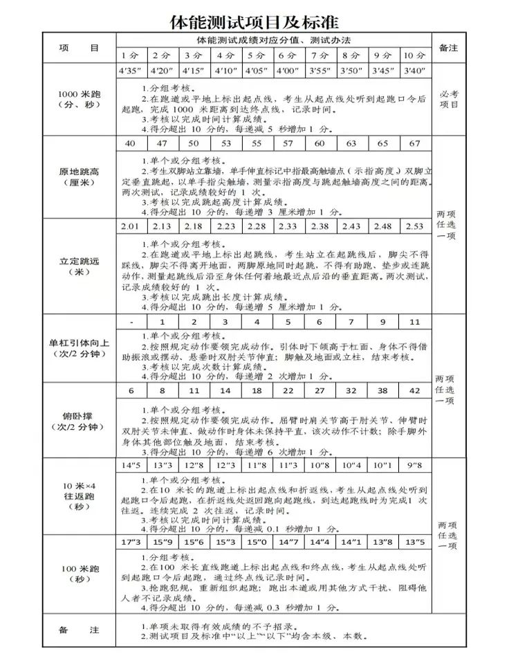 01體能、體型測試:標(biāo)準(zhǔn)參照《國家綜合性消防救援隊(duì)伍消防員招錄體能測試、崗位適應(yīng)性測試項(xiàng)目及標(biāo)準(zhǔn)》執(zhí)行。考核項(xiàng)目為:1000米跑必考項(xiàng);原地跳高、立定跳遠(yuǎn),兩項(xiàng)選一項(xiàng);單杠引體向上、俯臥撐,兩項(xiàng)選一項(xiàng);10米×4往返跑、100米跑兩項(xiàng)選一項(xiàng)。主要考察招收對象肌肉力量、肌肉耐力和爆發(fā)力等。