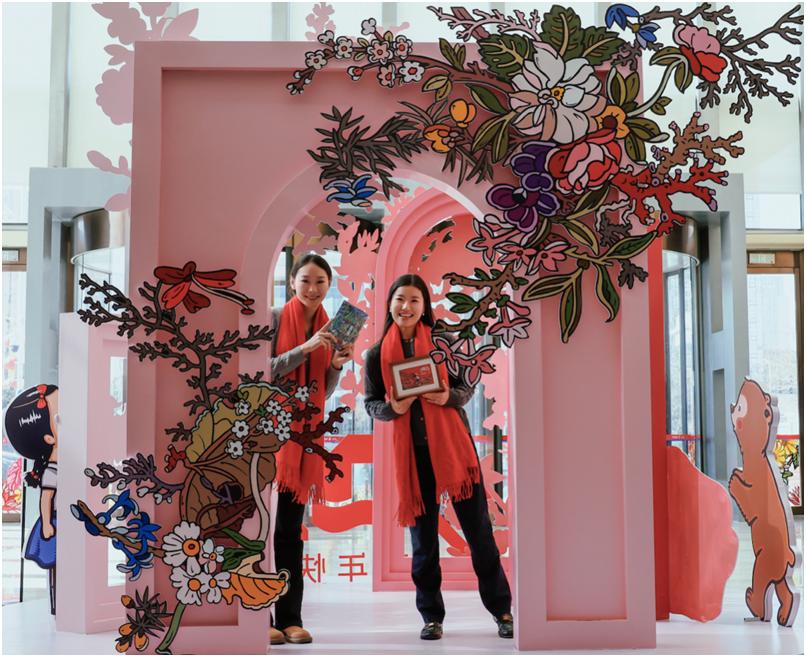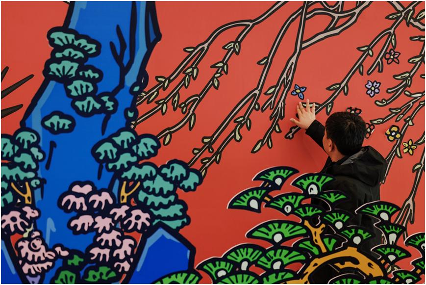 互動區(qū)——“送你一朵小紅花” “送你一朵小紅花”互動裝置打造了卜樺作品《春風(fēng)拂面》中太陽灑下溫暖光芒、祥云飄逸靈動、柳樹輕拂微風(fēng)、山峰屹立巍峨的自然仙境,構(gòu)建出極具沉浸感的互動場景。市民朋友可以在花朵貼紙上寫下對生活、對未來的美好愿望,并將其貼于背景墻上,用愛與期待編織希望的篇章。