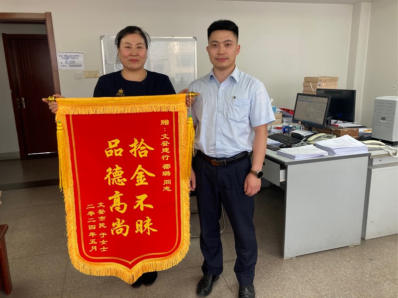 5月14日下午,于女士帶著一面錦旗來(lái)到建設(shè)銀行威海文登支行,詢問(wèn)邵璐是否在這里工作,要當(dāng)面感謝邵璐經(jīng)理。經(jīng)過(guò)于女士的講述,原來(lái)她的手機(jī)于上5月12日晚聚餐結(jié)束后丟失在路邊,而自己并未發(fā)覺(jué)。邵璐撿到手機(jī)后,在鎖屏照片里發(fā)現(xiàn)于女士工作的店名,繼而搜索到該店的抖音號(hào),通過(guò)老板聯(lián)系到于女士家屬,于女士這才得知自己手機(jī)丟失。
